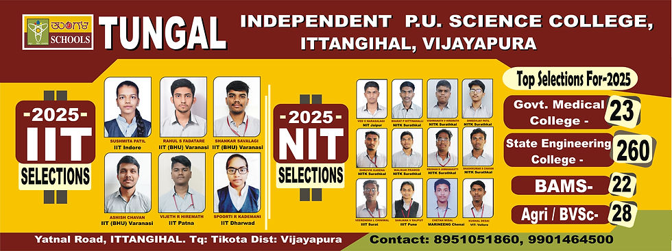 Tungal Schools, with campuses across North Karnataka in Jamkhandi, Hulyal, Bagalkot and Vijayapura, is committed to nurturing confident, well-rounded students. Each centre offers a calm, disciplined study environment, modern classrooms and caring faculty who guide students academically and personally. Known for consistently good results, Tungal Schools combine strong academic rigour with extracurricular opportunities so every child can grow, excel and prepare confidently for the future.